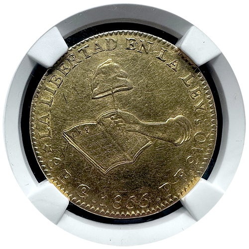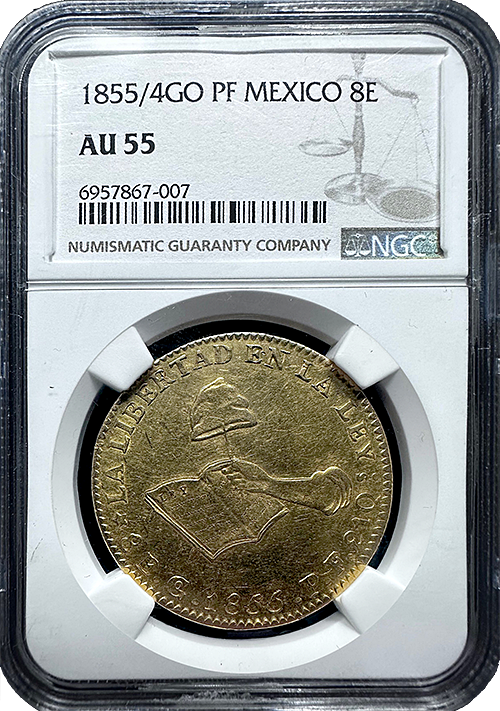 1855/4GO PF Mexico 8 Escudo Gold Coin – “Hand on Book” | NGC AU55