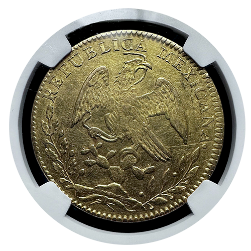 Certified by NGC in About Uncirculated 55, this coin exhibits sharp details and strong eye appeal for its grade, making it a standout example of mid-19th century Mexican gold coinage.