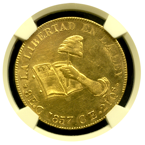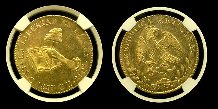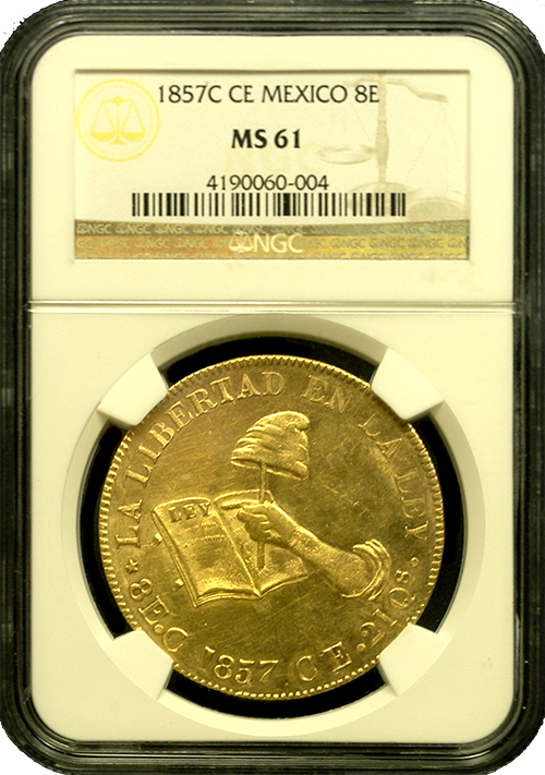 1857-Culiacan, Mexico 8 Escudo Gold Coin – “Hand on Book” | NGC MS61