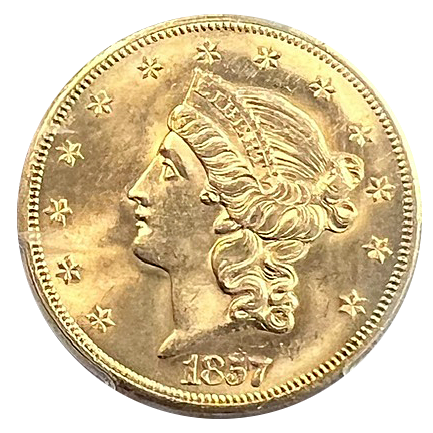 Introducing the 1857-S $20 Gold Liberty coin, a remarkable piece of history recovered from the legendary SS Central America shipwreck. Certified by PCGS in Mint State 63 with a Bold 7, Faint S condition, this coin offers a captivating glimpse into the bygone era of the California Gold Rush.