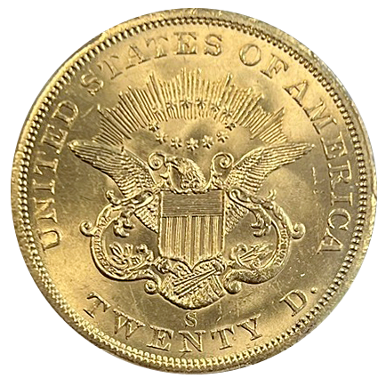 1857-S $20 Liberty Gold SS Central America PCGS MS-63