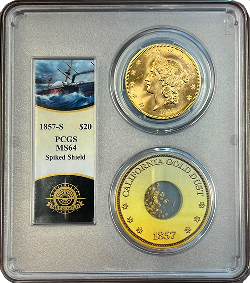 This exquisite 1857 San Francisco Double Eagle originates from the SS Central America shipwreck, famously known as the "Ship of Gold." Each coin has undergone meticulous curation to enhance its innate allure and has been officially certified and graded by PCGS to achieve a Mint State 64 condition. To safeguard the intricate details of these coins, they are securely encased in specially crafted PCGS holders.