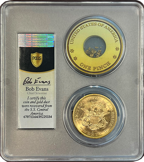 Furthermore, every holder contains a trace of gold dust salvaged from the shipwreck. Bob Evans, the esteemed Chief Scientist and overseer of the discovery has personally endorsed the PCGS grading certificate, affirming its authenticity as a genuine relic from the salvage mission. Our inventory of these coins is extremely limited, and each piece is presented in a distinctive collector's box as depicted in the accompanying imagery.