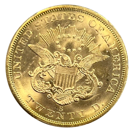 1857-S $20 Liberty Gold PCGS SS Central America MS-64