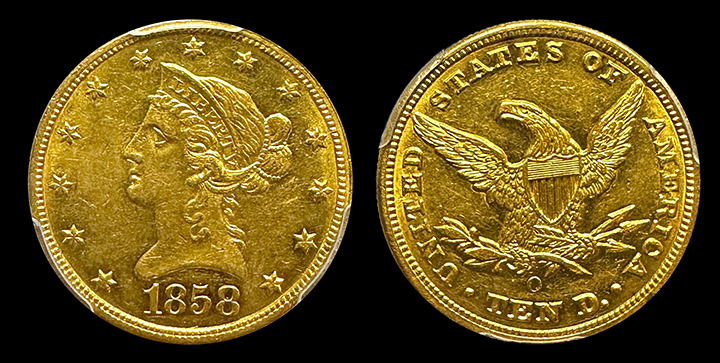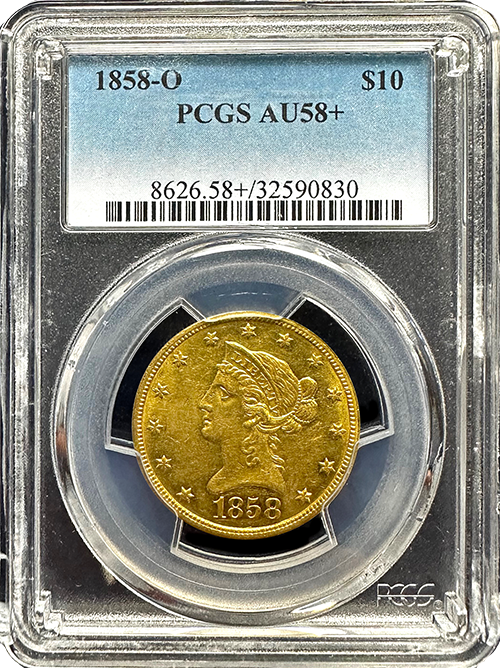 1858-O $10 Liberty Gold PCGS AU-58+