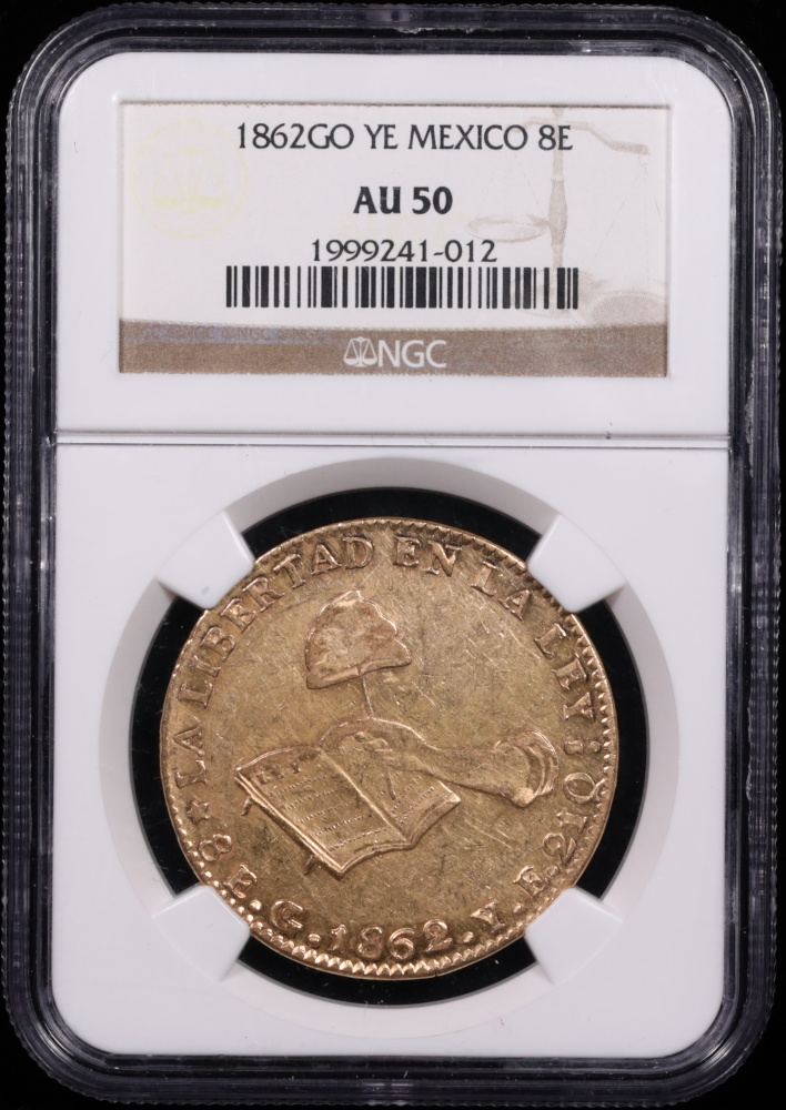 This 1862-GO YE 8 Escudos represents the premier gold denomination of the Mexican Republic during a turbulent period in the nation's history. Struck at the Guanajuato mint with assayer initials YE, this issue was produced just as Mexico faced the French intervention that would soon install Maximilian I as emperor. The 8 Escudos series from this era remains highly sought after by collectors of world gold coinage, and this example has been certified by NGC.