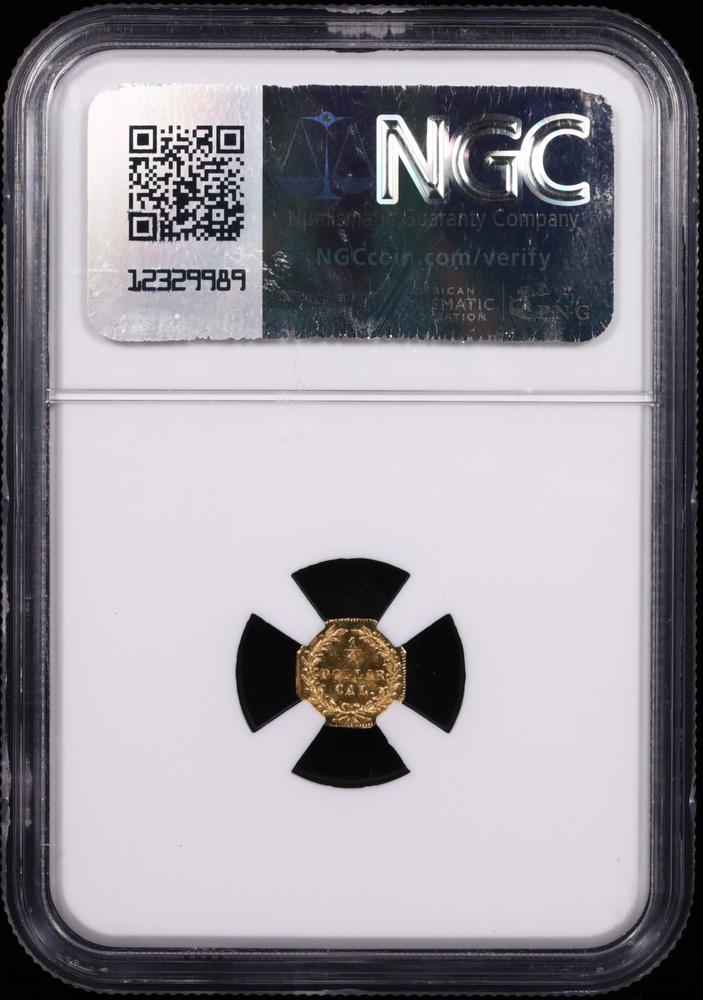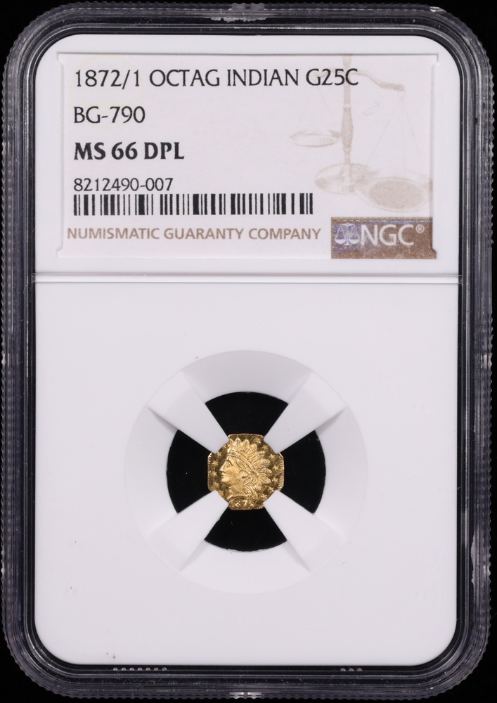 Finest known! This 1872/1 BG-790 California Fractional Gold Quarter Dollar represents one of the most distinctive private gold issues from the California Gold Rush era. Produced during the height of small denomination gold coin popularity in California, this octagonal quarter dollar served as legal tender when official small denomination silver coins were scarce on the West Coast. The BG-790 variety features a clear overdate, with the "2" struck over "1," making it a particularly sought-after variety among California fractional gold specialists.