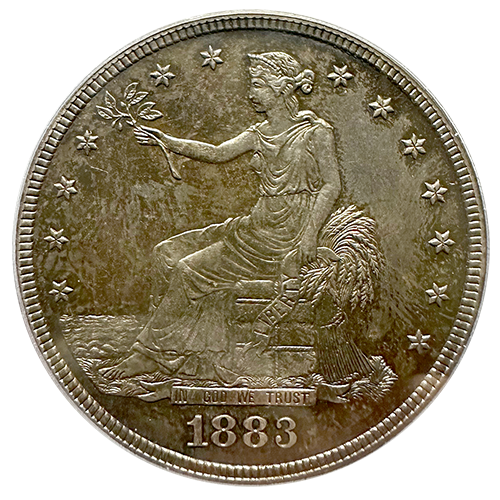 The obverse of the 1883 Trade Dollar features the elegant Seated Liberty, a design by Christian Gobrecht. Lady Liberty is shown seated on a rock, holding a shield in one hand and an olive branch in the other, symbolizing peace and protection. In PR-64 condition, the coin displays sharp details and mirror-like surfaces with minimal imperfections, underscoring its high quality.