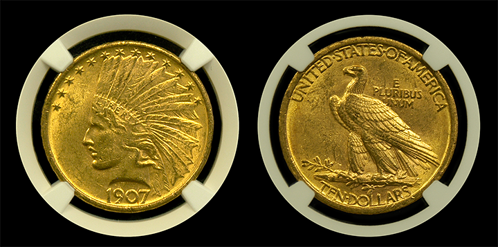 There are only 32 total coins in the $10 Indian Head program and there are only 15 coins that have lower mintage numbers than the 1907’s. These rank number 16 out of 32 for overall production, and since they are a first year of issue, they will always be more sought after.