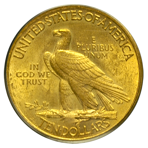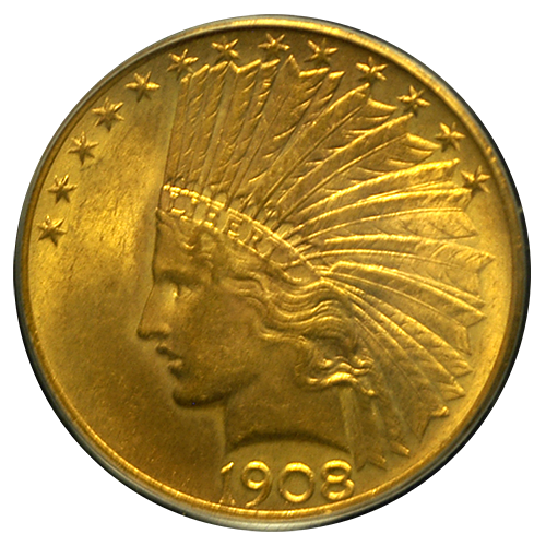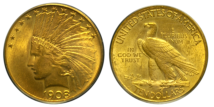 Only 341,370 $10 Indians were struck in Philadelphia with the motto, “In God We Trust” in 1908. This particular example has a fantastic overall look with no distractions on either side.