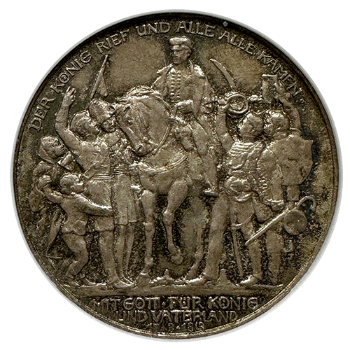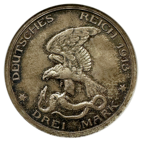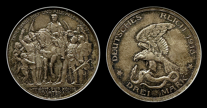 The obverse features King Frederick William III on horseback in the midst of cheering people, with his battle cry and date at the bottom. The reverse highlights the Prussian eagle with a snake in its talons, a powerful symbol of strength and unity, surrounded by the inscriptions denoting the denomination and issuing authority, "DEUTSCHES REICH" and "DREI MARK," along with the year of issue, 1913.