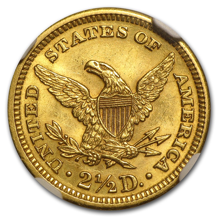 The Liberty Head design, created by Christian Gobrecht in 1840, features a portrait of Lady Liberty encircled by 13 stars representing the first 13 colonies while the reverse depicts the famed Heraldic Eagle. $2 ½ Liberty Head Gold coins were struck at: Philadelphia, Charlotte, San Francisco, Dahlonega and New Orleans.