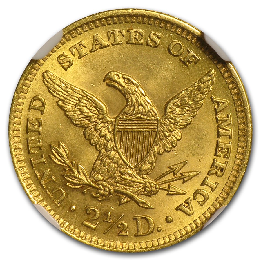 The Liberty Head design, created by Christian Gobrecht in 1840, features a portrait of Lady Liberty encircled by 13 stars representing the first 13 colonies while the reverse depicts the famed Heraldic Eagle. $2 ½ Liberty Head Gold coins were struck at: Philadelphia, Charlotte, San Francisco, Dahlonega and New Orleans.