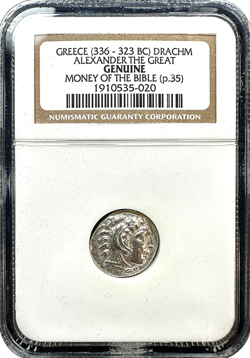 This Drachm was minted during the reign of Alexander the Great, who conquered vast territories from 336 to 323 BC. As a result, his coins circulated throughout the Mediterranean and beyond. This particular silver drachm features Heracles on the obverse and Zeus on the reverse, symbolizing strength and divine favor. These coins would have been used in the region during the intertestamental period and were likely encountered by people mentioned in Daniel and other prophetic books of the Bible. (p.35)