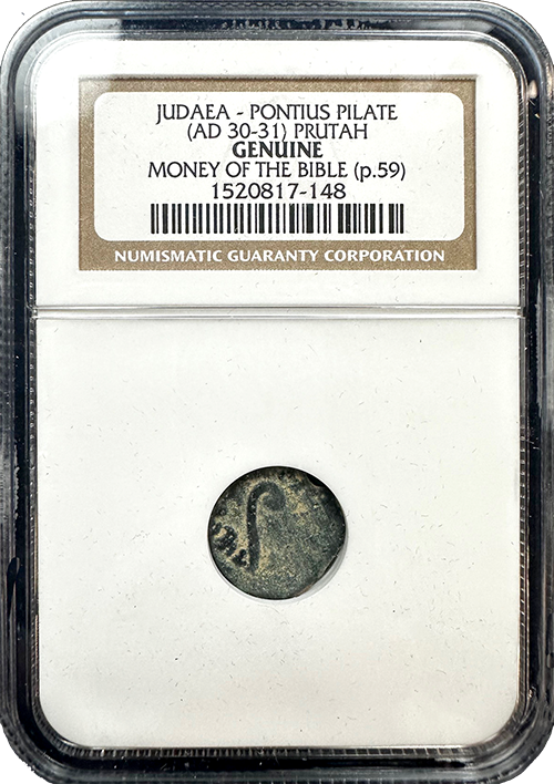 This Prutah was minted during the time of Pontius Pilate, the Roman governor of Judea, from AD 30-31. Pilate is best known for his role in the trial and crucifixion of Jesus, as documented in all four Gospels. This bronze coin was circulated when Jesus was active in his ministry, and it would have been in common use among the people of Judea. The coin’s connection to Pilate and circulation during one of the most pivotal moments in Christian history make it an important piece for collectors. (p.59)
