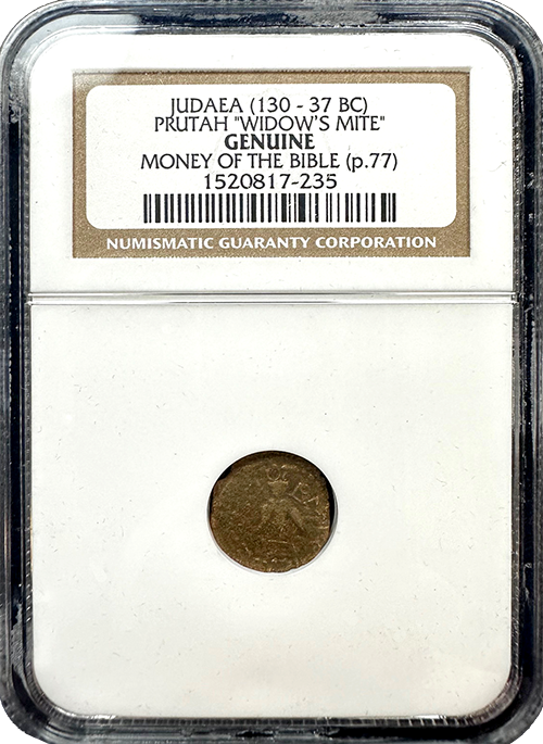 The Prutah, commonly known as the "Widow's Mite," was a small, low-value coin minted between 130 and 37 BC during the Hasmonean Dynasty. This coin is famously mentioned in the New Testament in Mark 12:41-44 and Luke 21:1-4, where Jesus commends a poor widow for her humble offering of two mites despite their insignificant value. The coin’s simplicity and humble origins remind itself of faith and sacrifice, making it one of the most well-known Biblical coins. (p.77)