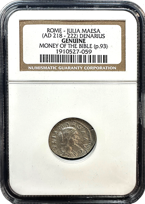 This silver Denarius was struck in honor of Julia Maesa, the grandmother of Emperor Elagabalus and a key political figure in Rome from AD 218 to 222. Julia Maesa was influential in restoring the Severan dynasty to the Roman throne. While not directly mentioned in the Bible, the coin represents the broader Roman world and its influence on the Judean province during the early years of Christianity. Coins like these would have been in circulation during the early church. (p.93)