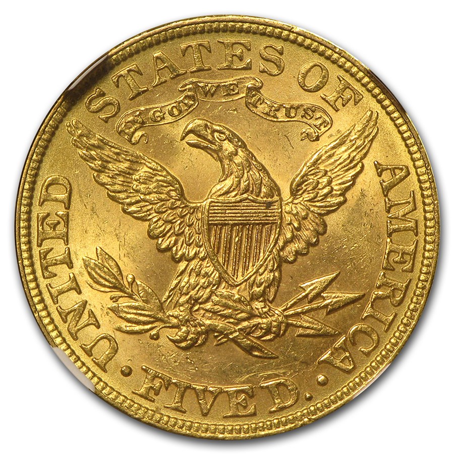 The Half Eagle was the first gold coin actually struck for the United States. The $5 piece was authorized to be coined by the Act of April 2, 1792 and the design was created by Christian Gobrecht. It features a portrait of Lady Liberty encircled by 13 stars representing the first 13 colonies while the reverse depicts the famed Heraldic Eagle.
