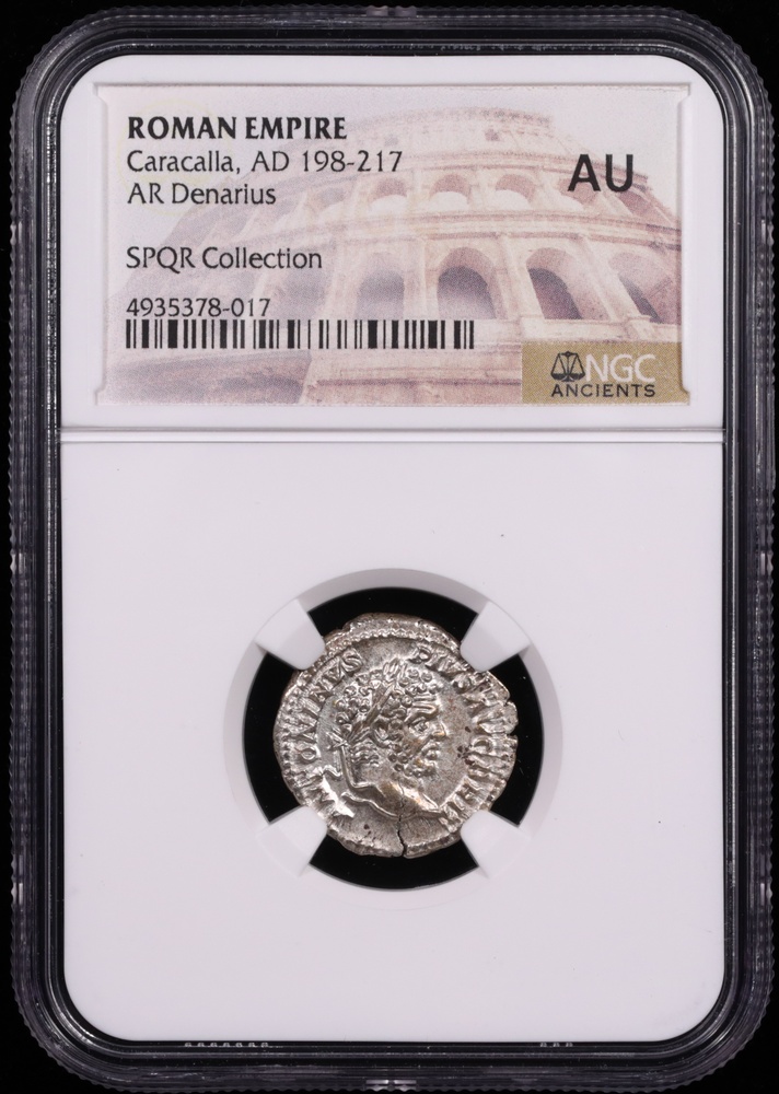 Caracalla ruled the Roman Empire from AD 198 to 217, initially as co-emperor with his father Septimius Severus and later as sole ruler following his brother Geta's murder. This silver denarius dates from his reign and was struck at the Rome mint, the principal facility producing imperial coinage during the Severan dynasty. The coin is certified by NGC Ancients with an About Uncirculated grade and carries the SPQR Collection pedigree.