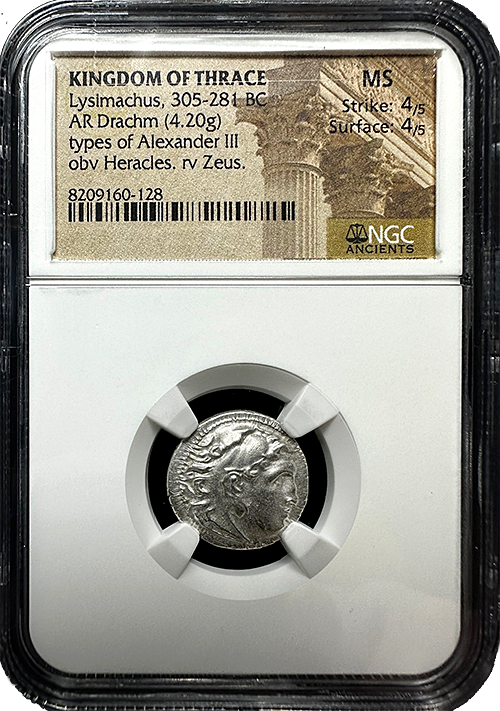 This stunning Silver Drachm from the reign of Lysimachus (305-281 BC) is a remarkable piece of ancient Greek coinage, struck in honor of Alexander III "The Great". Weighing 4.20 grams, this coin is certified by NGC Ancients in Mint State condition, with a Strike rating of 4/5 and Surface rating of 4/5, making it an exceptional and well-preserved example of this historically significant type.