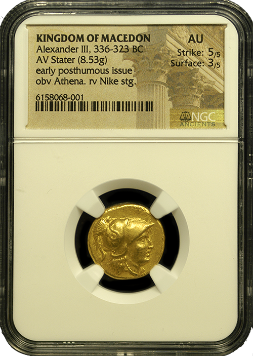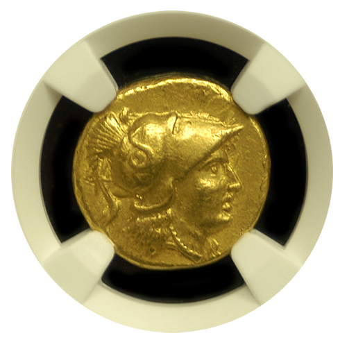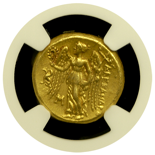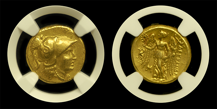 One of the most popular of all gold ancients, this gold stater was struck just after the death of Alexander the Great in 323 B.C. It is a near-mint condition example with radiant surfaces atop a great strike. Athena is shown on the obverse and Nike, the goddess of victory, is standing on the reverse.