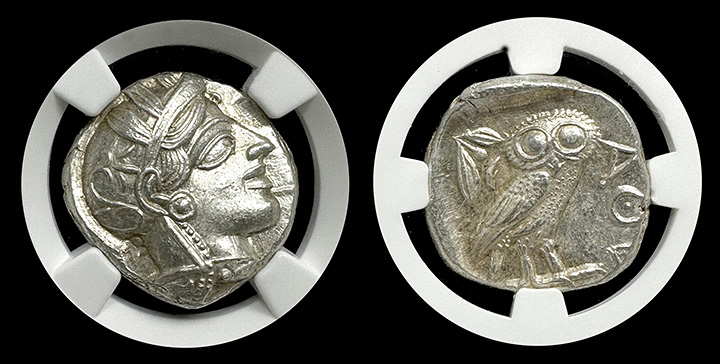 In the book entitled, The 100 Greatest Ancient Coins, the #10 highest ranked coin is the Athenian Silver Tetradrachm, commonly known at the Attica Silver Owl. Struck over 2,400 years ago, these large 17 gram silver coins are each one of a kind and depict the goddess Athena on the obverse and an owl on the reverse. These coins were extensively circulated across the ancient empires for hundreds of years.