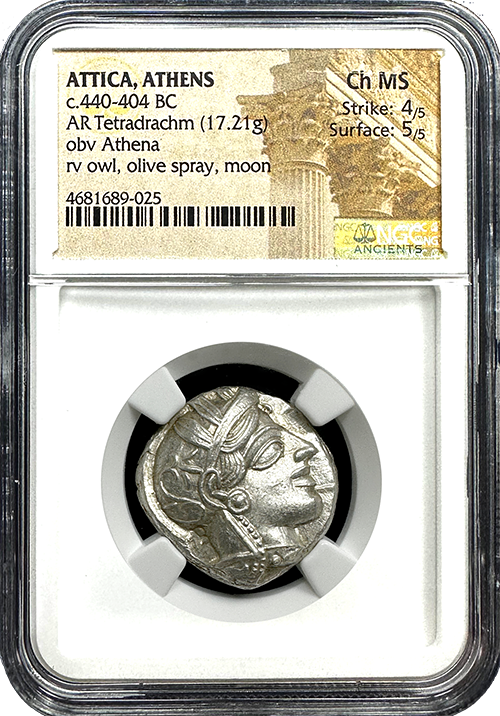 Check out this Choice Mint State with a 4/5 strike and a perfect 5/5 surface! Out of the thousands of Athenian Owls certified, very few attain such high levels of preservation over the past 2,450 years.