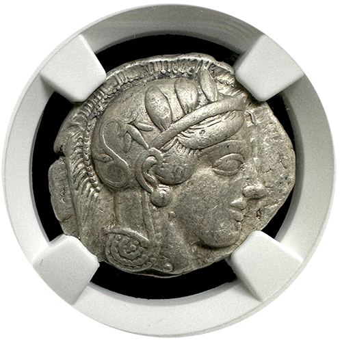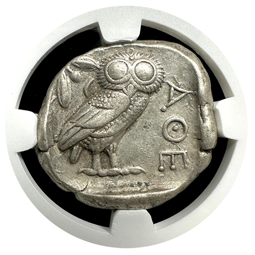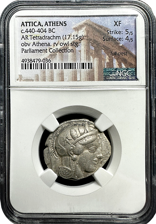 We are pleased to present the Athenian Silver Tetradrachm, also known as the Attica Silver Owl, in an extraordinary Extremely Fine condition. This remarkable coin holds a strike grade of 5/5 and a surface grade of 4/5, showcasing its exceptional quality. Minted over 2,400 years ago, these large 17-gram silver coins are truly one-of-a-kind. The obverse features the goddess Athena, while the reverse proudly displays an intricately designed owl—a symbol of wisdom and knowledge.