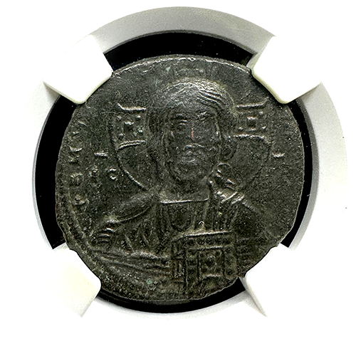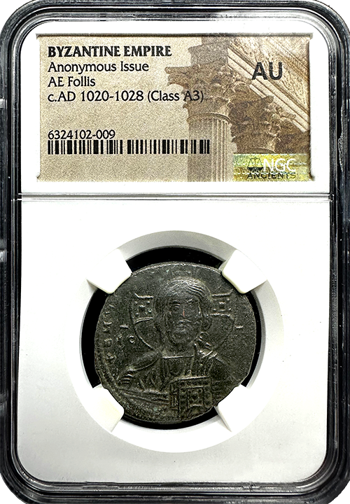 The Byzantine Empire produced a remarkable coinage that reflects the richness of the civilization. One of the notable pieces is the anonymous AE Follis issued between 1020 and 1028 AD, known as Class A3. The coin features a bust of Christ on the obverse, with his head facing forward and holding the Gospels. The reverse side displays an inscription surrounded by a four-line border. This beautiful coin, certified by NGC in Choice About Uncirculated condition, is a rare find for collectors.