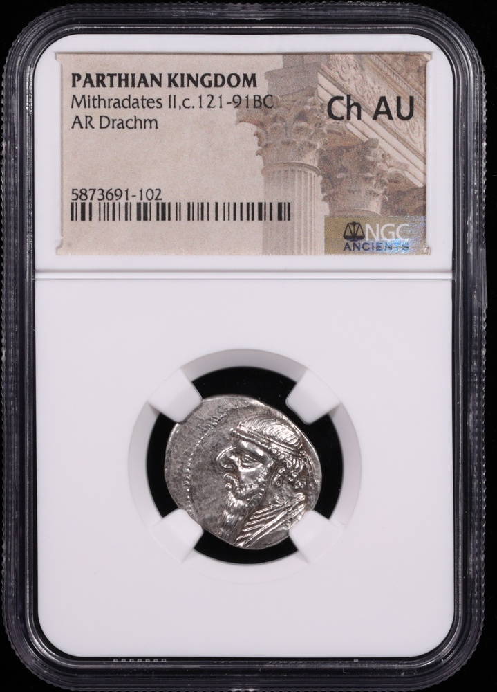 Mithradates II, often regarded as the greatest ruler of the Parthian Empire, reigned from approximately 121 to 91 BC during a period of remarkable territorial expansion and diplomatic achievement. Under his leadership, Parthia extended its dominion across Mesopotamia and Armenia while establishing the first formal contacts with both Rome and Han Dynasty China, effectively positioning the empire at the crossroads of the ancient world. This silver drachm, certified by NGC as Choice About Uncirculated, represents the coinage of a sovereign who bore the title "King of Kings" — a designation reflected in the Greek legends carried on his currency.