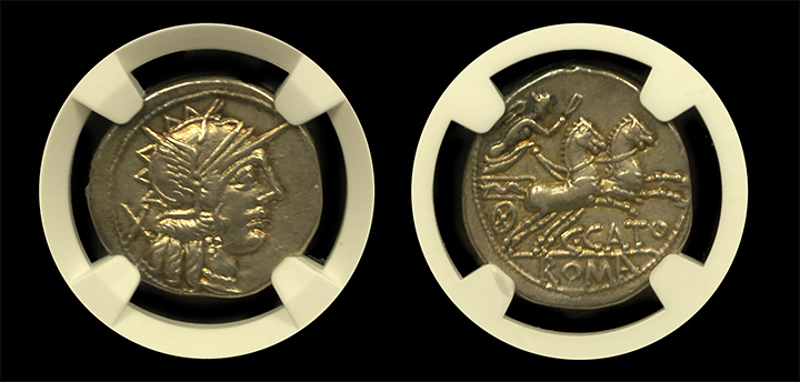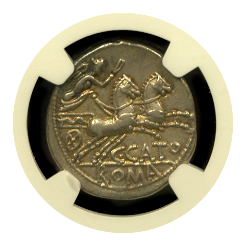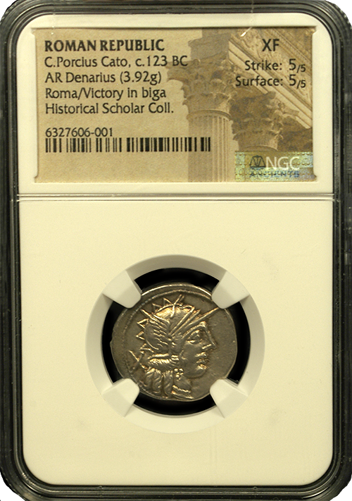 This is not a commonly encountered Roman denarius, in fact, this is the first of its type that we have handled. The overall strike and color make for a wonderful example of Roman coinage dating back around 2,000 years. Cato was an influential conservative Roman senator during the late Republic whose conservative principles were focused on the preservation of what he saw as old Roman values in decline. Highly recommended and quite rare in such a high grade.