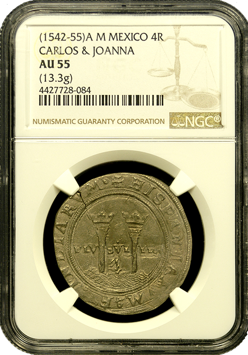 Thus, the Carlos and Joanna 4 Reale was produced, 250 years before the U.S. mint was even founded! This is the first time we've offered them and these are among the finest examples known today. Beautifully toned and completely original, these have been certified by NGC to be in near mint, AU-55 condition. We feel these early-issue four reales are absolutely solid values for the price.