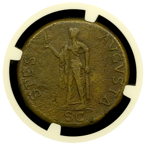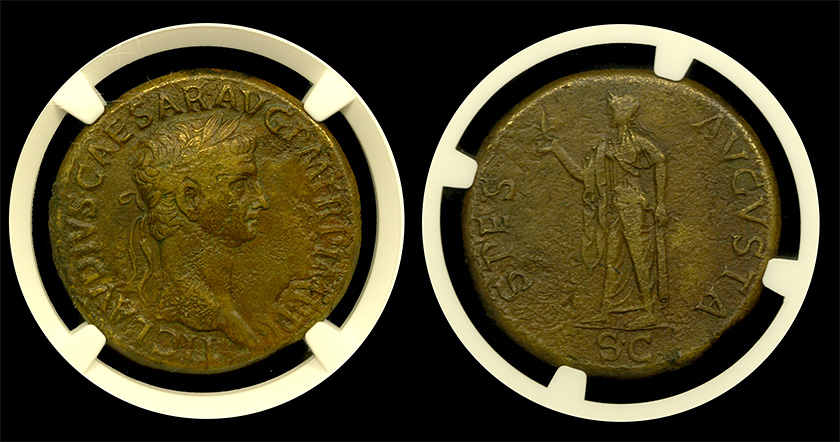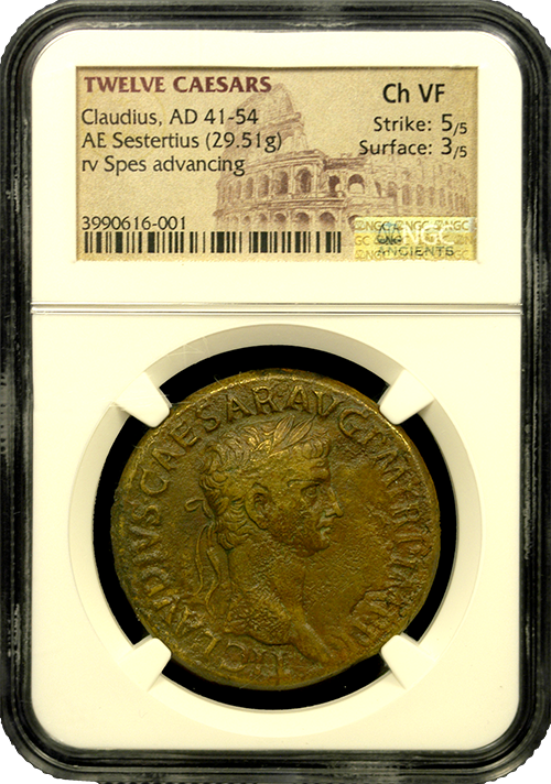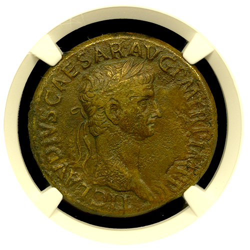 Truly a unique Roman coin, this large bronze coin is called a sestertius and was everyday money that circulated widely across the Roman Empire. This particular coin depicts Emperor Claudius, who ruled from 41-54 AD, in lifelike form facing right, on the obverse.