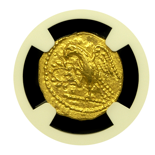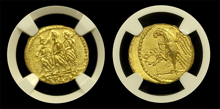 These fascinating Coson gold staters were struck over 2,100 years ago and depict three soldiers in a procession on the front and an intricate Eagle holding an Olive wreath on the back. Certified by NGC Ancients in Choice Uncirculated condition, this particular example has exceptional eye appeal and a fantastic strike for the assigned grade.