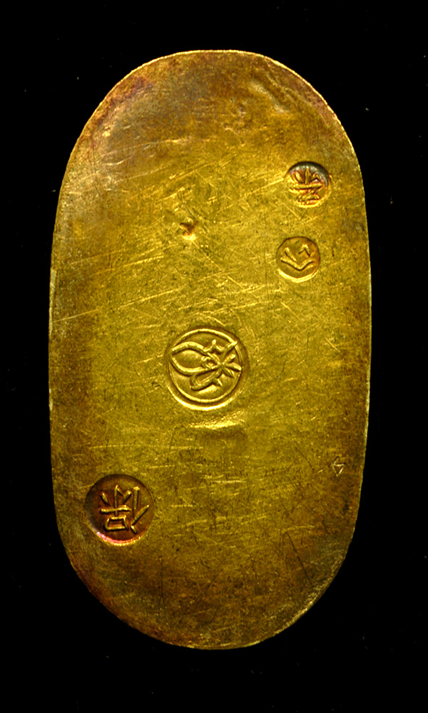 This unusual-looking gold bar is from Japan in the early to mid-1800s. They're called a gold "koban" and they were not necessarily intended to be used in everyday circulation but instead were oftentimes given as gifts to influential and powerful leaders of the country. Each koban is stamped on the front and back with various symbols