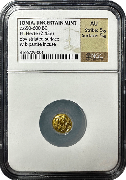The Ionia El Hecte from 650-600 BC is a rare and intriguing coin, representing some of the first coins ever made. This particular piece, weighing 2.43 grams, is certified by NGC Ancients in About Uncirculated condition with a Strike rating of 5/5 and a Surface rating of 5/5, indicating its remarkable quality and preservation. Given its historical significance and unique design, this coin is a valued artifact from ancient Ionia.