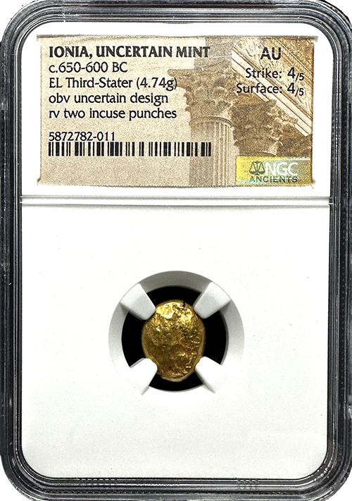 About Uncirculated Condition and Rarity: This El Third-Stater from Ionia is a rare find in About Uncirculated condition, with a Strike rating of 4/5 and a Surface rating of 4/5. Its well-preserved state, given its age, makes it a highly desirable addition to any numismatic collection.
