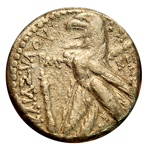Reverse Design: On the reverse, the coin depicts an eagle standing on a ship's prow, a classic symbol of Tyre’s maritime power and economic influence. The eagle holds a palm branch, symbolizing peace and victory. Surrounding the eagle are inscriptions in Greek, affirming Tyre as the city of origin for these shekels. The well-preserved details make this coin a standout piece for collectors, capturing the essence of its ancient provenance.
