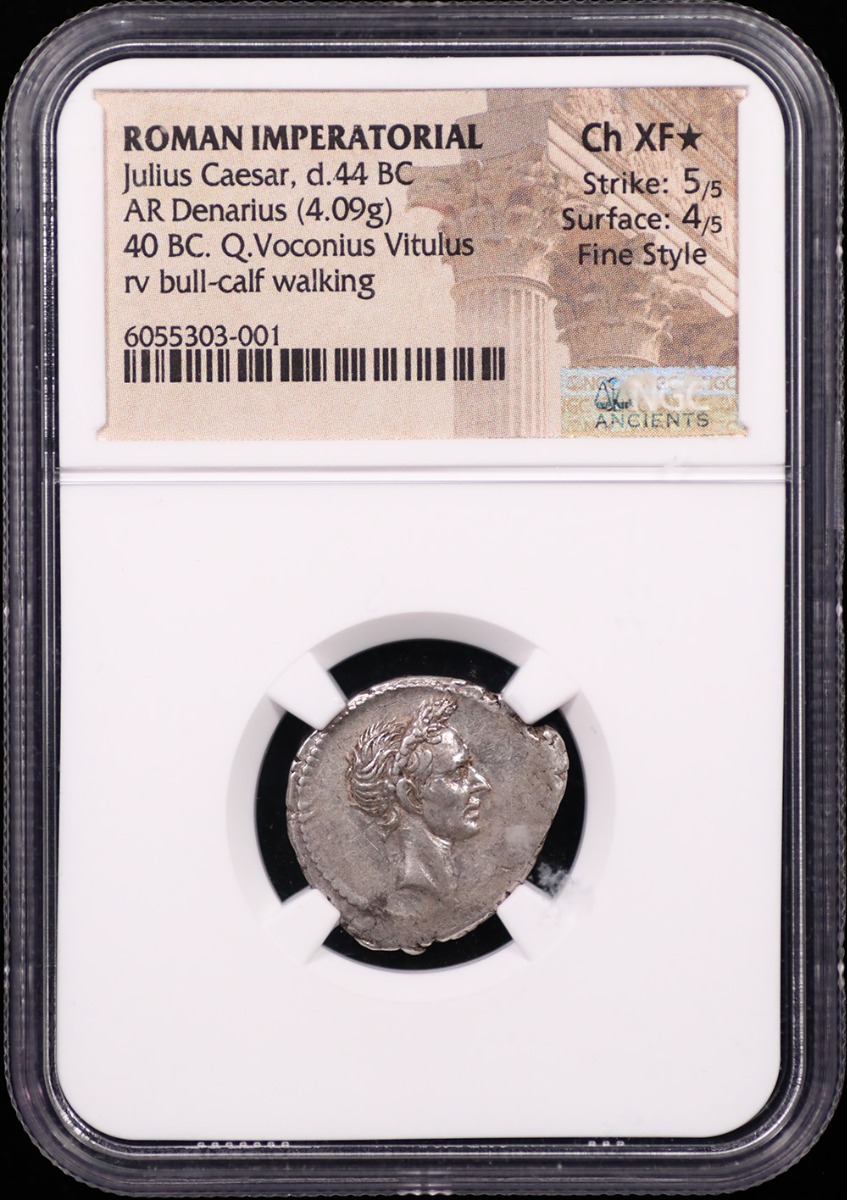 The obverse features the right-facing portrait of Julius Caesar, laureate and rendered with exceptional realism—his thinning hair, sharp profile, and dignified expression marking one of the earliest true portraits of a living Roman. This lifelike representation established a numismatic precedent that defined Imperial portraiture for centuries. The reverse depicts a bull-calf walking left, symbolizing strength, fertility, and sacrificial devotion—an emblem of both Roman piety and the enduring cult of Caesar’s divinity. The legend identifies the responsible moneyer, Q. Voconius Vitulus, whose name fittingly translates to “calf.”