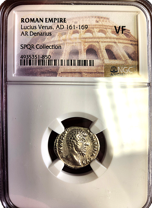The Roman Empire Lucius Verus Denarius, certified by NGC Ancients in Very Fine condition, was minted between 161-169 AD. It has excellent detail for the assigned grade and all design elements are totally visible. This silver coin captures the essence of his rule, which was marked by military campaigns and imperial authority.
