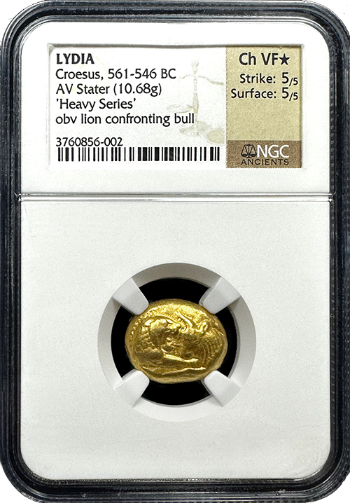 This Heavy Stater of Croesus is the first gold coin series in human history dating back to 561 BC! We feel this example is very conservatively graded--further justified by the coveted Star designation from NGC Ancients, implying fabulous quality and eye appeal.