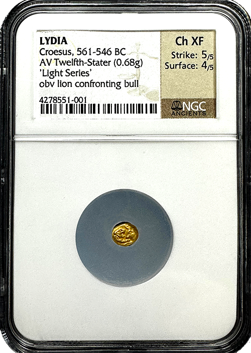 The Lydia, Croesus AV 12th Stater, minted during the reign of the legendary King Croesus between 561-546 BC, is a numismatic marvel that offers us a precious glimpse into one of the wealthiest and most influential rulers of the ancient world. Weighing a mere 0.68 grams, this small yet significant gold coin is rated as Choice Extremely Fine, boasting an impressive Strike rating of 5/5 and a Surface rating of 5/4.