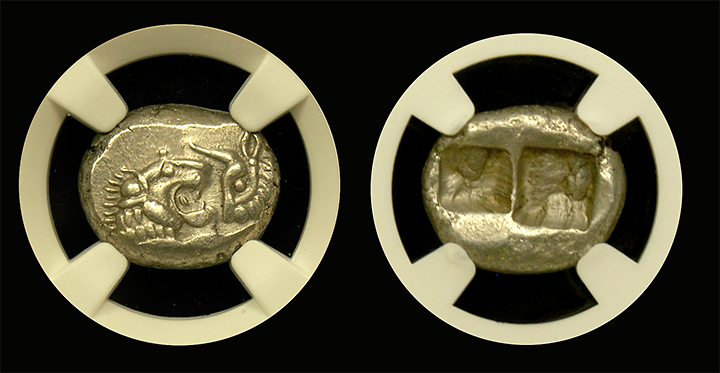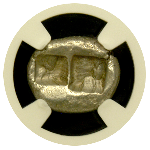 Introducing the Lydia Croesus Silver Half Stater/Siglos, a captivating relic from 561 BC that offers a glimpse into the ancient world's rich history. Certified by NGC in About Uncirculated condition, this coin weighs 5.38 grams and boasts a remarkable Strike rating of 5/5, ensuring sharp and clear details.