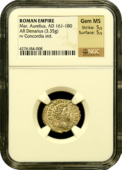 The Roman Empire Marcus Aurelius AD 161-180 Silver Denarius is a prestigious coin from the reign of one of Rome's most renowned emperors. This coin, certified by NGC Ancients as Gem Mint State, boasts a perfect Strike rating of 5/5 and a Surface rating of 5/5, exemplifying its exceptional preservation and numismatic quality.