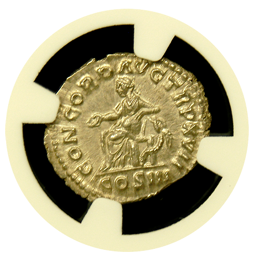 This Silver Denarius, certified by NGC Ancients in Gem Mint State, is in pristine condition. Its perfect Strike rating of 5/5 indicates sharp and well-defined details, and its Surface rating of 5/5 indicates minimal wear. The coin's exceptional preservation enhances its historical and collector's value, making it a sought-after piece among numismatists and ancient history enthusiasts.