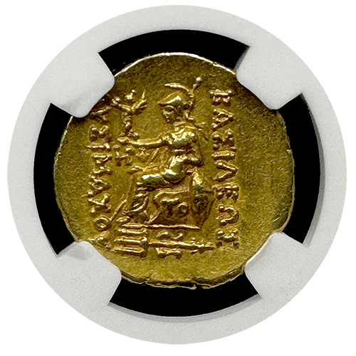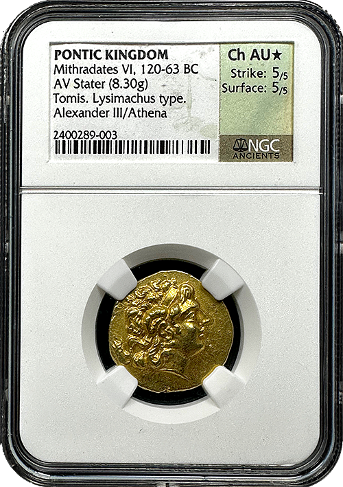Acquire a piece of history with the Pontic Kingdom Mithradates VI Gold Stater, a captivating relic from 120-63 BC. Certified by NGC Ancients in About Uncirculated condition with a remarkable Strike of 5/5 and Surface quality graded at 5/5, this coin is a testament to the artistry and historical significance of the era. In addition, a STAR has been given, signifying exceptional eye appeal for this particular example.