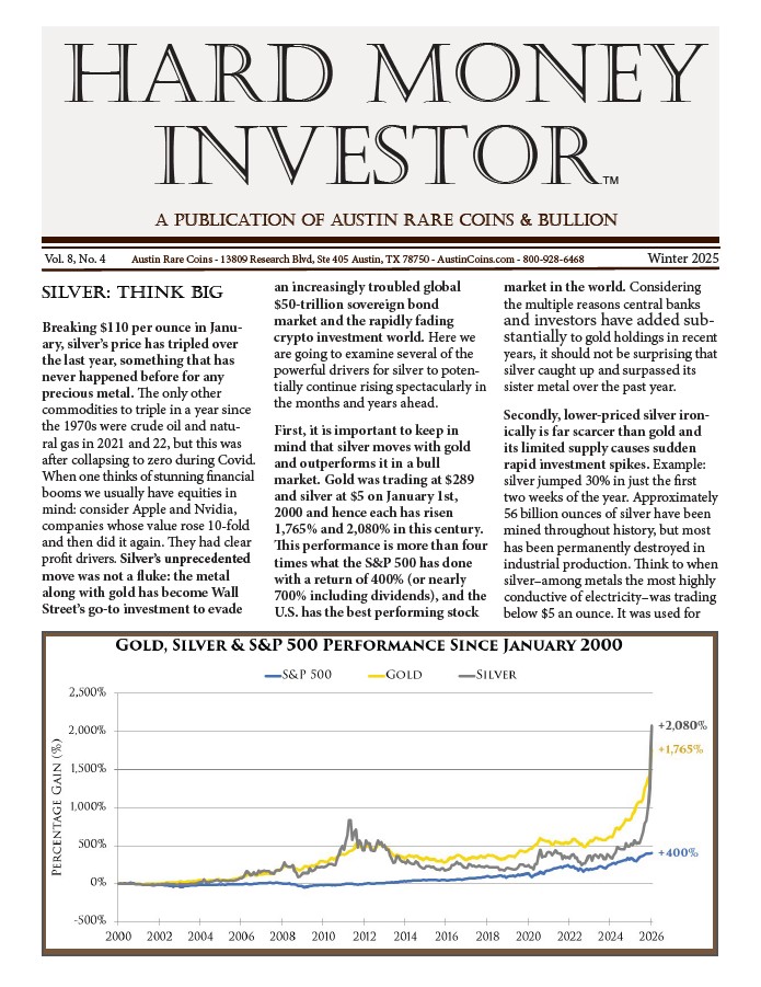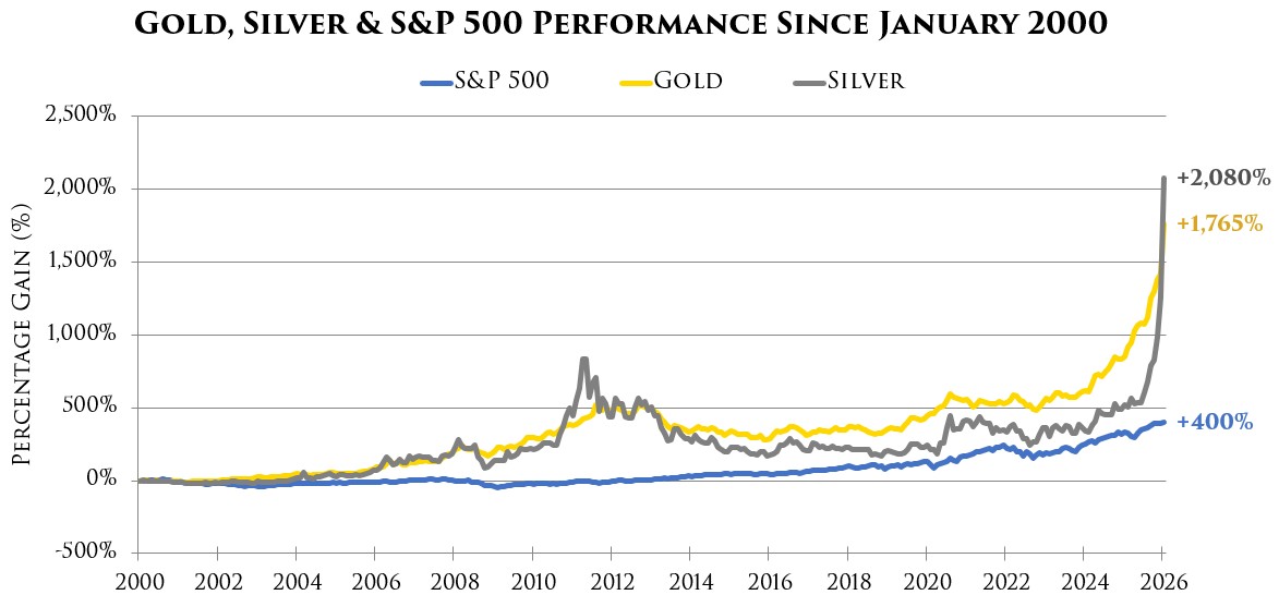 Since January 2000, silver is up 2,080% and gold 1,765% - more than four times the S&P 500's 400% return. The U.S. has the world's best-performing stock market, yet precious metals have dramatically outpaced it this century.