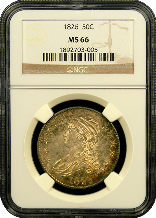 Razor-sharp detail and iridescent color can be seen around the edges of this pristine superb gem Capped Bust Half Dollar from 1826.