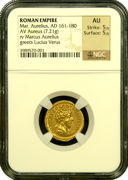 Remarkably pristine gold coin featuring beloved Roman Emperor Marcus Aurelius. This coin has a rare reverse where he is welcoming his new successor,