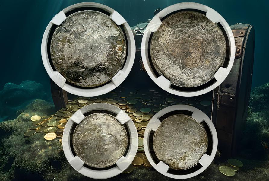 There are two types of coins that were recovered in surprisingly remarkable condition. Each coin has been hand-selected for quality and eye appeal. While our supplies last, we are offering the larger-sized Chilean Pesos for $539 and the 50 Centavos for $475.